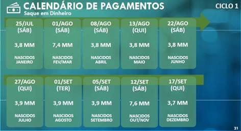 Os ciclos de crédito em conta e saques em espécie seguem até dezembro para o pagamento das cinco parcelas definidas pelo Governo Federal para o público do CadÚnico e para quem se cadastrou pelo App CAIXA | Auxílio Emergencial ou pelo site auxilio.caixa.gov.br.