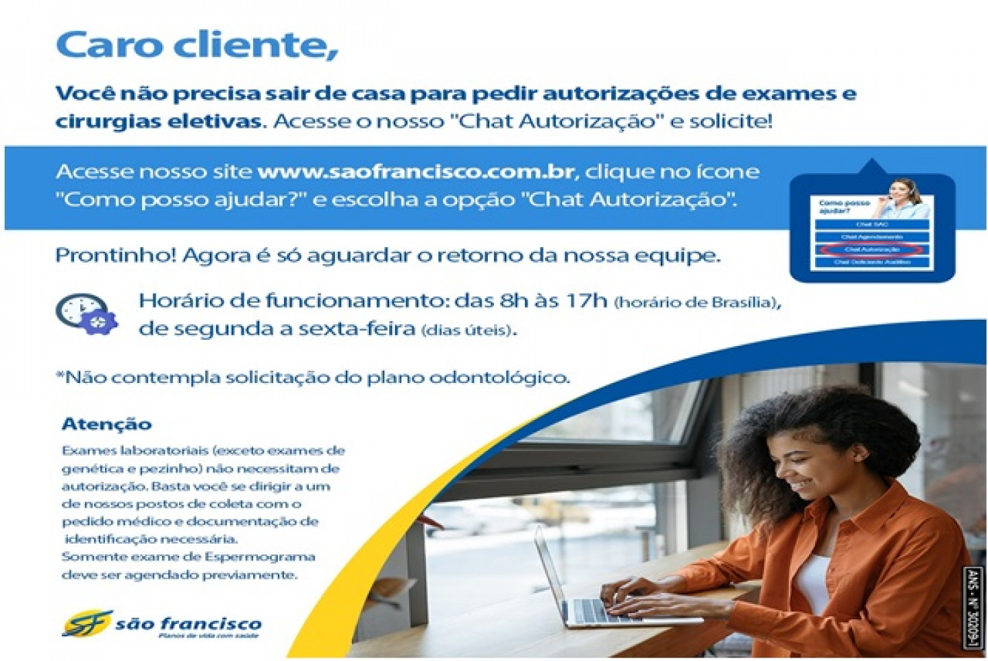 Você que possui o Plano São Francisco Saúde, não precisa mais sair de casa para pedir autorizações de exames e cirurgias eletivas. Acesse o site: www.saofrancisco.com.br, clique no ícone “Como Posso Ajudar?” e escolha a opção “Chat Autorização”.