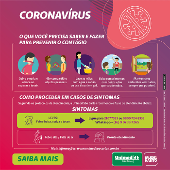 A Unimed São Carlos comunica que a partir de 24/03/2020, o Pronto Atendimento Pediátrico passa a ser realizado na unidade do Unifácil, localizado na Rua Capitão Adão Pereira da Silva Cabral, 730, no Centro.