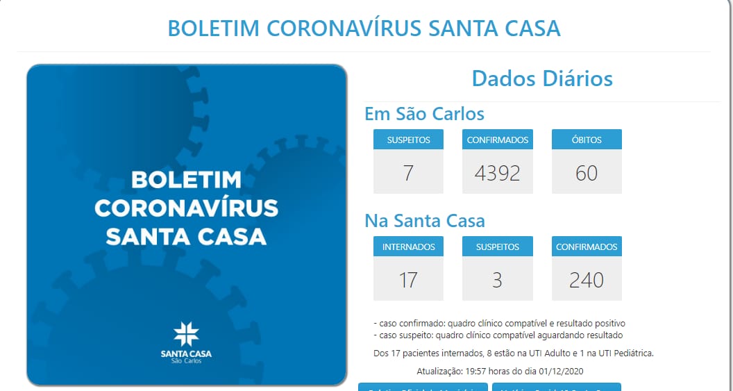 Nesta terça-feira (01/12), até o momento em que os dados foram levantados para este boletim, não houve registros de óbitos nas ALAS COVID da Santa Casa.