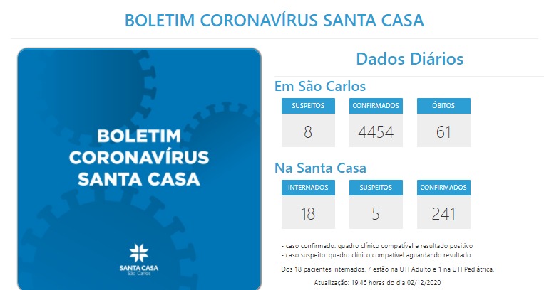 *1 novo caso confirmado: 1 homem, 75 anos, de São Carlos, internado nesta segunda-feira (2/12), já com diagnóstico de COVID-19
