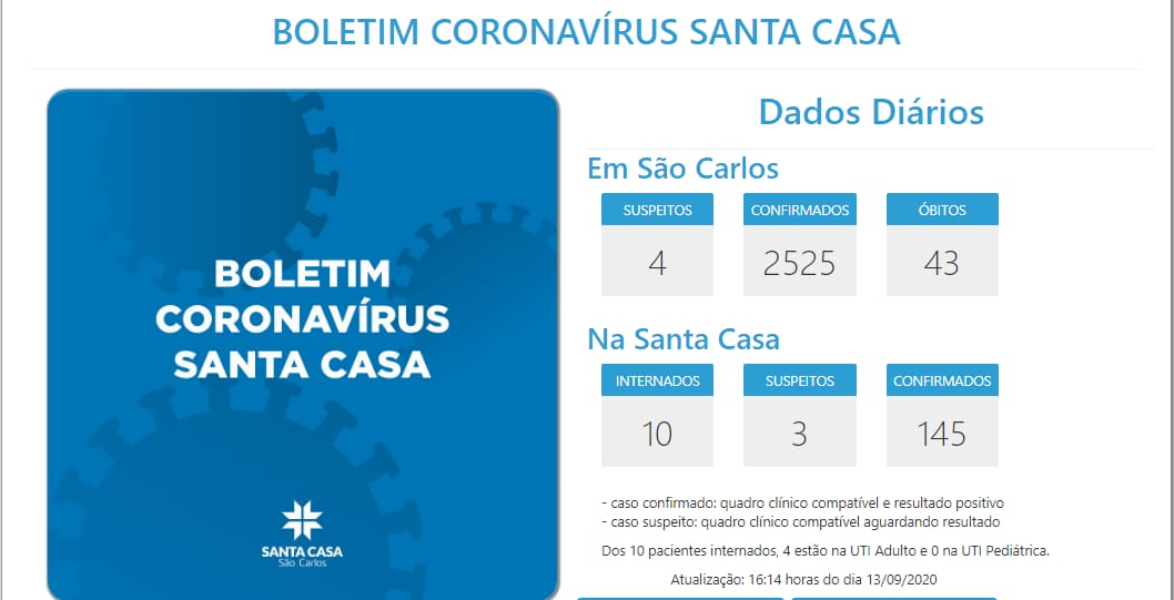 2 novos casos confirmados: 1 homem, 63 anos, de São Carlos, internado no sábado (12/9) e para que o resultado de exame positivo foi liberado no mesmo dia; 1 mulher, 32 anos, de São Carlos, internada neste domingo (13/9) já com diagnóstico de COVID-19.