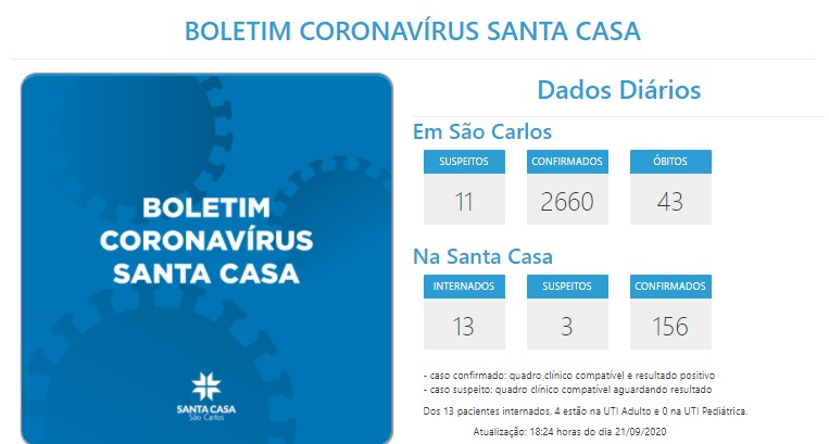 1 novo caso confirmado: 1 mulher, 90 anos, de São Carlos, internada no domingo (20/9), já com diagnóstico de COVID-19.