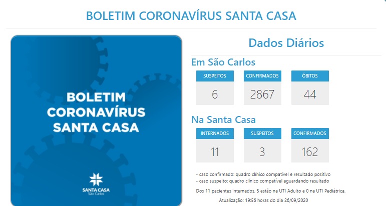 1 novo caso confirmado: 1 homem, 72 anos, de São Carlos, internado neste sábado (26/9), já com diagnóstico de COVID-19.