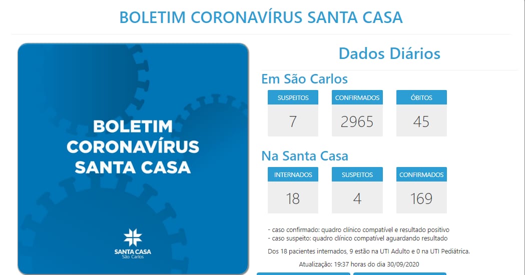A Santa Casa informa que 1 homem, 76 anos, de São Carlos, para quem o resultado de exame deu negativo, faleceu na terça-feira (29/9).