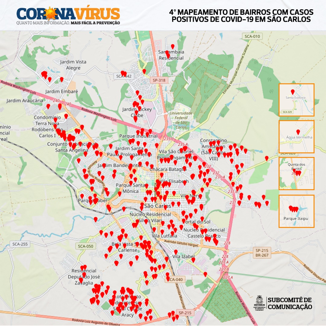 A Vigilância Epidemiológica de São Carlos e o Comitê Emergencial de Combate ao Coronavírus informam os bairros em que já foram relatados casos positivos de COVID-19. Esta lista de bairros é complementar ao Relatório de Casos 04, divulgado na última quarta-feira (01/07), a partir dos dados do mesmo.