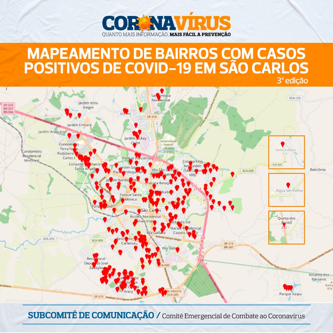 A Vigilância Epidemiológica de São Carlos e o Comitê Emergencial de Combate ao Coronavírus informam os bairros em que já foram relatados casos positivos de COVID-19. Esta lista de bairros é complementar ao Relatório de Casos 03, divulgado na última terça-feira (23/06).