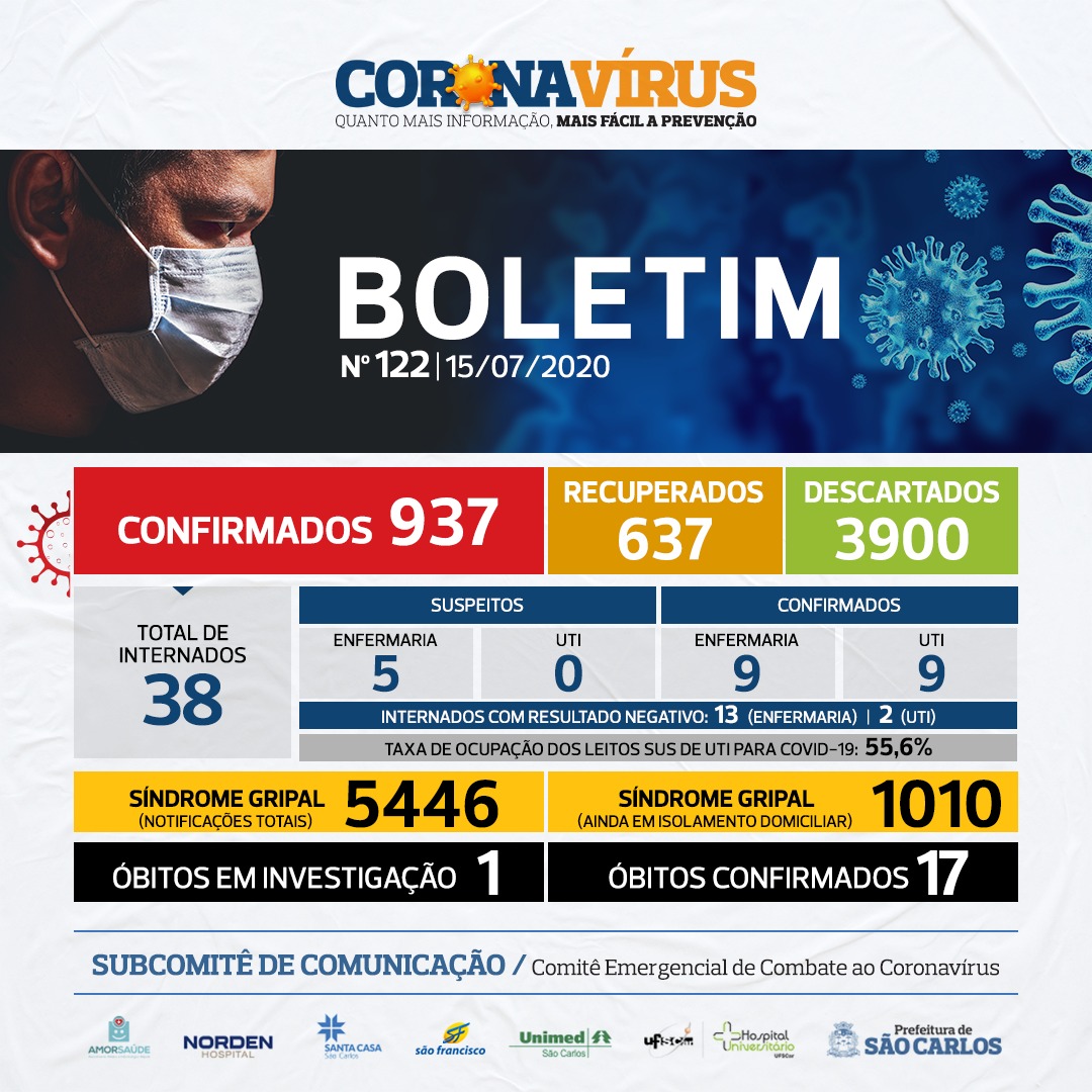 NÚMEROS COVID-19 SÃO CARLOS – 15/07 – BOLETIM Nº 122