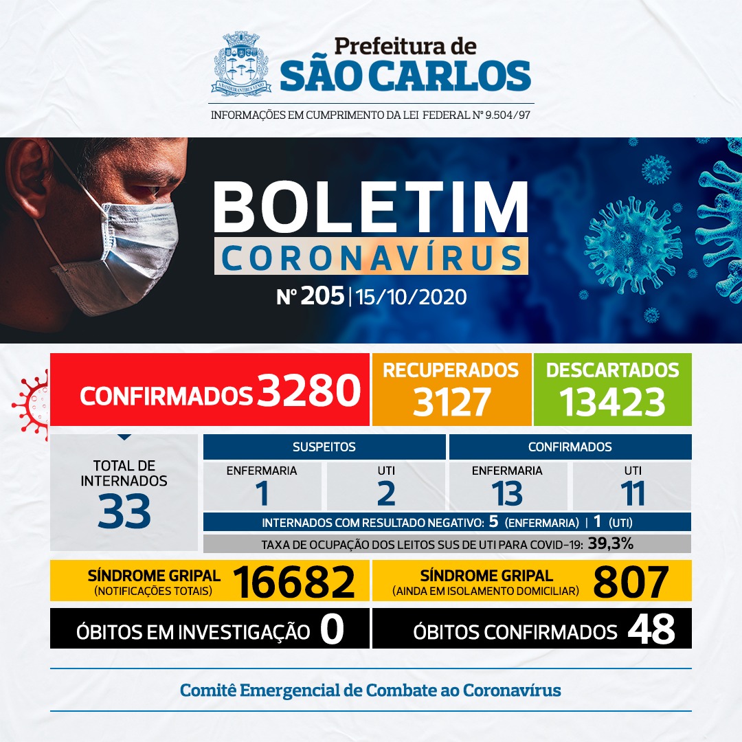 NÚMEROS COVID-19 SÃO CARLOS – 15/10 – BOLETIM Nº 205