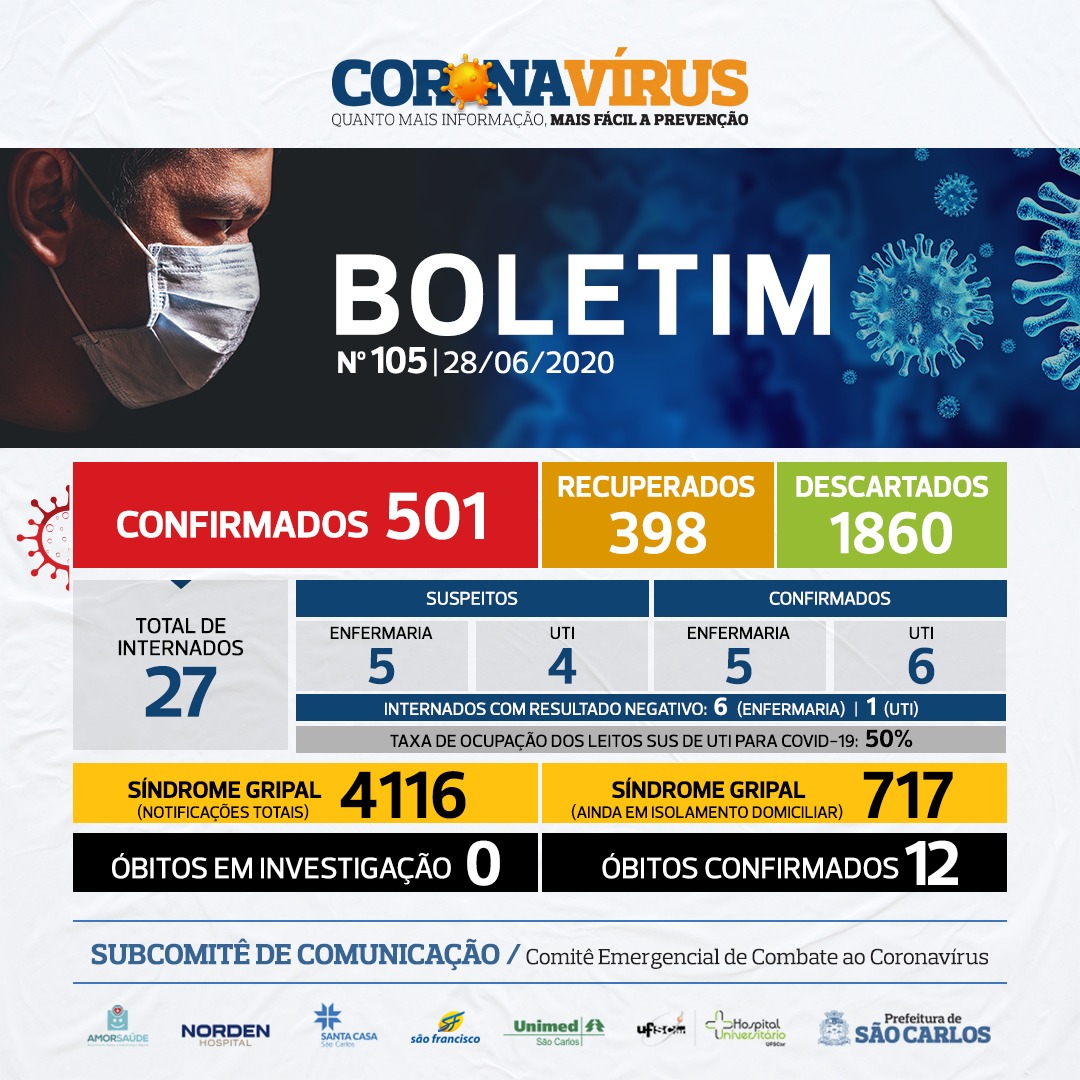 NÚMEROS COVID-19 SÃO CARLOS – 28/06 – BOLETIM Nº 105