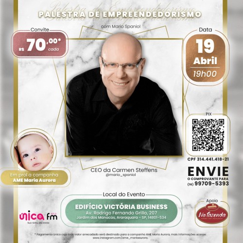 Nesta terça-feira (19), às 19 horas, o Edifício Victória Business, em Araraquara, sediará a palestra de empreendedorismo de Mario Spaniol, CEO da Carmen Steffens. A entrada custa R$ 70 e será revertida para a campanha AME Maria Aurora.